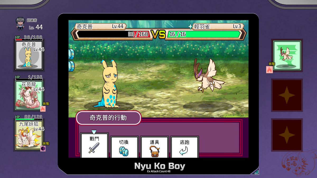 這畫面一看就知道致敬寶可夢,身上只能帶3隻Yarimon,不過能隨時跟備用的切換,一樣有治療中心跟商店等。